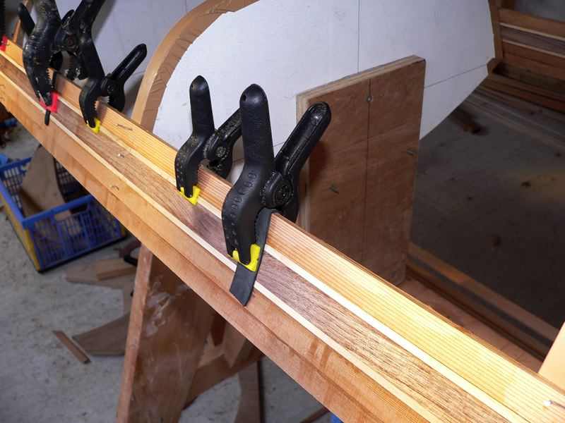 017 The forms are spaced about eighteen inches apart on this boat and it is important to secure the strips between stations laterally and compressively. I use inner tube rubber to give some compression.