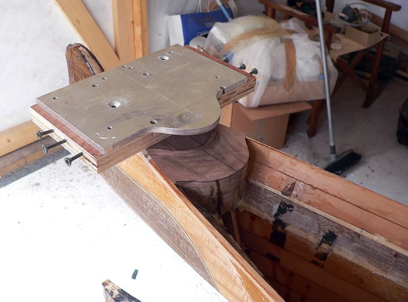 043 The upper bow piece rebated to receive the deck planking. The router jig is ground from aluminium.