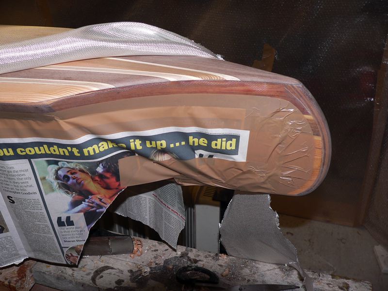 The hull is masked off at the line between the first and second strips. The deck glass is used to join the hull to the deck.